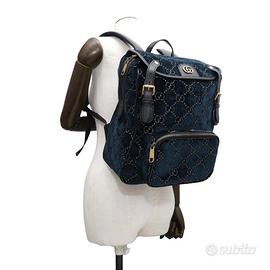 Questo zaino Gucci, modello codice 574942, è realizzato in velluto blu e presenta una combinazione di chiusure a patta e a zip. Include una tasca con zip e una tasca aperta all'interno per l'organizzazione. L'hardware è rifinito in oro, aggiungendo un tocco di eleganza.