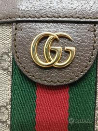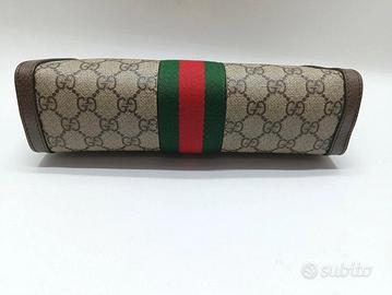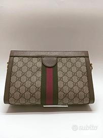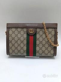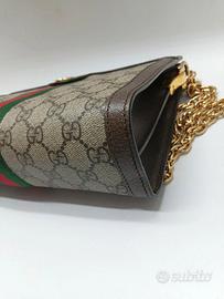 Borsa a spalla Gucci con tracolla a catena realizzato intessuto GG Supreme con profili in pelle marrone e completato dal nastro Web verde e rosso