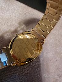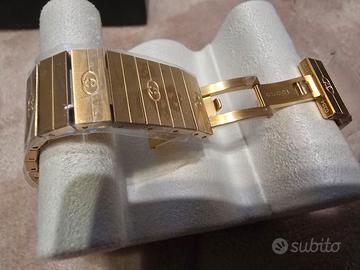 Vendo splendido orologio Gucci Grip, referenza YA157403, un pezzo dal design unico e vintage che fonde eleganza contemporanea e stile rétro. L'orologio è caratterizzato da una cassa squadrata in PVD oro giallo con tre aperture (finestre) che indicano rispettivamente: ora, minuti e data. Il quadrante e il bracciale sono finemente incisi con l'iconico motivo GG di Gucci. Dettagli principali: Stato: Nuovo, mai indossato (ancora con pellicole protettive e sigilli). Movimento: Quarzo Swiss Made di alta precisione. Dimensioni: Cassa da 38 mm (unisex, veste benissimo su ogni polso). Materiale: Acciaio con finitura PVD Oro Giallo. Resistenza all'acqua: 3 ATM (30 metri). Corredo: Completo di etichetta originale e scatola (come da foto). Un orologio distintivo, perfetto per collezionisti o per chi cerca un accessorio di lusso che non passi inosservato. vendo per non utilizzo , regalo di amici mai indossato