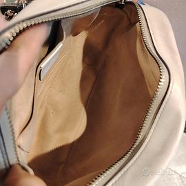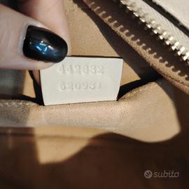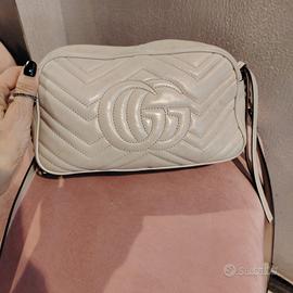 Iconica borsa Gucci GG Marmont modello "camera bag" in misura piccola. Un classico senza tempo della Maison, perfetta sia per il giorno che per la sera grazie al suo design elegante e versatile GG Marmont Small Camera Bag Pelle matelassé con motivo chevron (trapuntatura a V). Bianco (o "Dusty White") con finiture in metallo color oro. Logo Doppia G frontale e cuore impunturato sul retro. Tracolla regolabile in pelle e catena. Fodera in microfibra effetto scamosciato con una tasca aperta Larghezza 24 cm x Altezza 13 cm x Profondità 7 cm (circa). Ottime condizioni Lieve segno di penna nella fodera interna