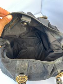 Fornisco con scatola e sacchetta. dello ampio da indossare a mano o a tracolla. Borsa molto capiente con tasca interna con zip e due tasche laterali. Esterno in tela e pelle (manici e inserti su entrambi i lati in pelle), interno in cotone. Chiusura con bottone magnetico per un facile accesso e sicurezza. I lati possono essere allargati tramite due bottoni, che permettono di stringere o allargare la borsa.