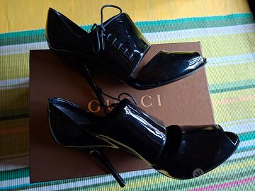 Gucci sandali vernice lucida pelle e cuoio neri con tacco a spillo e chiusura con lacci laterale. Tg. 36.5