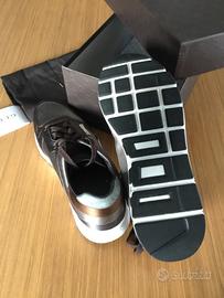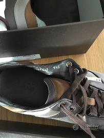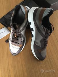 Sneaker GUCCI, MODELLO 336613 KND602194 Materiale pelle e raso di seta, Colore marrone medio/silver/cacao Veste 42,5/43 Nuovo con scatola e certificato di autenticità.