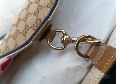 Borsa in tela monogram beige con inserti in pelle marroni. Interno in tela bianco. Pochette in pelle con possibilità di tenerla all’interno della borsa tramite tracollina oppure staccare e utilizzare separatamente. Chiusura a gancio in metallo color oro. Bordi consumati (tutti e 4) e imperfezioni come da foto.