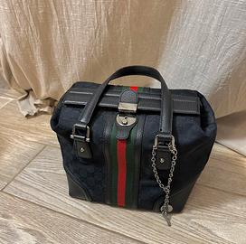 Gucci vintage Doctor Bag in tela GG Canvas nera. Appartiene alla collezione con il classico nastro Web, in tela monogrammata "GG" nera con finiture e manici in pelle martellata nera. La chiusura a scatto metallica sulla parte superiore con la piccola chiavetta appesa alla catenella, la struttura rigida che si apre in modo ampio. È un pezzo degli anni 2000 e non è più in produzione nelle boutique ufficiali.