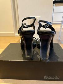 Pelle nera con fibbia e tacco trasparente iconico.