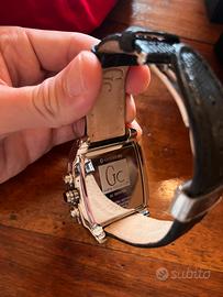 Cronografo Swiss Made con cassa in acciaio e cinturino in pelle nera.