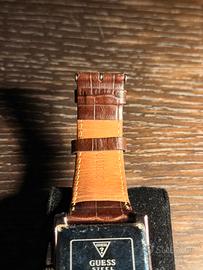 Vendo orologio da uomo GUESS Mainframe, originale, modello W0010G3, dal design elegante e moderno. Caratteristiche principali: •Marca: GUESS •Modello: Mainframe •Referenza: W0010G3 •Movimento: Quarzo •Funzioni: Ore, minuti, secondi, 24 ore, cronografo •Cassa: Acciaio inox con trattamento ion-plating •Forma cassa: Rettangolare •Dimensione cassa: 36 mm (senza corona) •Spessore cassa: 8,2 mm •Quadrante: Marrone •Vetro: Minerale •Cinturino: Pelle marrone effetto coccodrillo, chiusura ad ardiglione •Impermeabilità: 5 ATM (30 metri) Condizioni: Orologio usato, in buone condizioni generali, perfettamente funzionante. Normali segni di utilizzo compatibili con l’età. Ideale come orologio elegante o casual, adatto all’uso quotidiano. Whatsapp: 3275992089