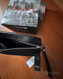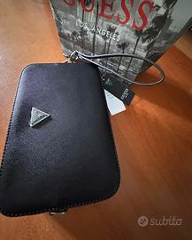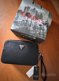 Realizzata in materiale di qualità con finitura saffiano, colore nero classico con logo triangolare Guess in metallo argentato sul davanti.