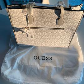 Shopper Silvana G Cube Grande Stone Logo Guess, borsa a spalla donna in materiale sintetico con trama Logo Cube, piedini in metallo, doppio manico e tasca esterna con zip. Chiusura con clip magnetica e interno foderato completo di tasca a parete con cerniera.