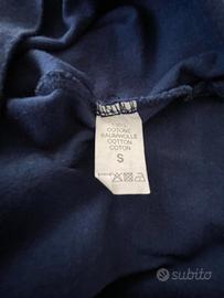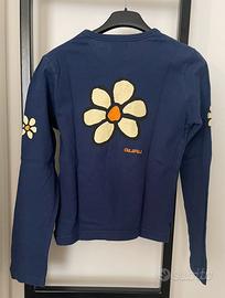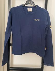 Guru t-shirt blu maniche lunghe in cotone. Per donna e bambina. Colore: blu, logo giallo e arancione. Senza difetti. Taglia S. Dimensioni in cm: spalle 36; lunghezza 48; lunghezza manica 56.