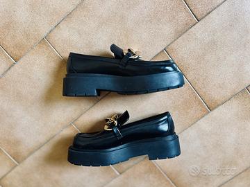 Eleva il tuo stile con questi mocassini H&M in similpelle nera con suola platform chunky. La catena dorata sul davanti aggiunge un tocco di eleganza e carattere, rendendoli perfetti sia per outfit casual che per occasioni più formali: feste, uscite in città, lavoro o meeting di business.