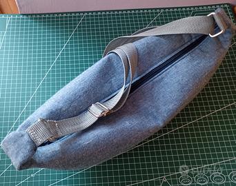 giovane e originale borsa in stoffa a mezzaluna, Hobo bag moda donna di quest' anno, fatta a mano in leggero tessuto jeans, foderata e con ampia tasca interna, cinghia regolabile a spalla o tracolla