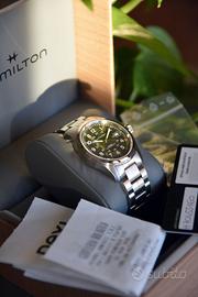 Dalla mia collezione privata, in condizioni pari al nuovo, propongo il field watch più celebre di casa Hamilton, nella nuova colorazione verde militare. Segni praticamente impercettibili dovuti a sporadico utilizzo. Caratteristiche: 📌 Cassa da 38mm compatta ed equilibrata, con bracciale robusto ma confortevole 📌 Movimento H-10 con 80h di riserva di carica 📌 Quadrante verde con finitura soleil, molto luminoso e distintivo 📌 Perfettamente funzionante ✅ Full set: scatola, controscatola, libretto, garanzia timbrata 2025, tutte le maglie del bracciale. Acquistato nuovo presso Gioielleria Pasquali Domenici (Viareggio). 💰 Prezzo migliore in Europa. Non sono interessato a permute. 📦 Spedizione a carico dell’acquirente (da definire) o consegna a mano in provincia di Livorno previo saldo anticipato. 📸 Non accetto resi. Le foto sono parte integrante della descrizione.