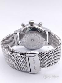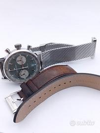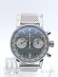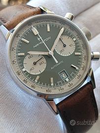 Hamilton American Classic Intra-Matic Auto Chrono – Green Dial Eleganza Vintage, Precisione Moderna. Proponiamo splendido Hamilton Intra-Matic Auto Chrono (Ref. H38416160), un pezzo iconico che richiama il design storico del 1968. L’orologio è in eccellenti condizioni, indossato pochissime volte e trattato con la massima cura. Dettagli Tecnici: Movimento: Automatico Calibro H-31 (60 ore di riserva di carica). Cassa: Acciaio inossidabile da 40 mm (misura perfetta per ogni polso). Quadrante: Verde oliva con contatori "Panda" bianchi e scala tachimetrica. Vetro: Zaffiro bombato antigraffio. Impermeabilità: 10 bar (100m). Dotazione Esclusiva – Doppio Bracciale Originale: L'orologio viene fornito con due cinturini originali Hamilton, offrendo due look completamente diversi: Maglia Milanese (Steel Mesh): Originale Hamilton, in condizioni pari al nuovo. Pelle: Originale Hamilton, in ottime condizioni, ideale per un look più classico. Corredo e Garanzia: Full Set: Scatola originale e libretto di garanzia ufficiale Hamilton. Garanzia Supplementare: 12 mesi sul corretto funzionamento garantita dal nostro laboratorio Viola Orologi. Disponibile presso: Viola Orologi – Poggiomarino (NA)