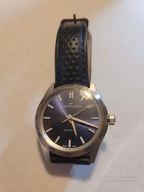 Cassa in acciaio, quadrante blu e cinturino in pelle blu traforata, vetro zaffiro antiriflesso, fondello a vista. Movimento automatico, calibro H-10 con riserva di carica sino a 80 ore, corona a vite, impermeabilità 10 bar.