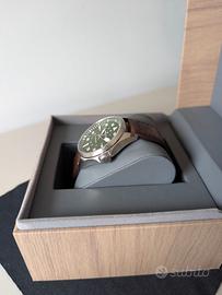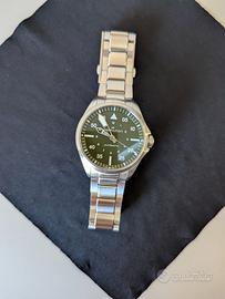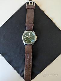 Khaki Aviation Pilot Auto 39mm - Ref. H76305560. Movimento automatico: Calibro H-10 (riserva di carica 80 hr). Dimensione cassa 39mm. Spessore (mm) 11.6. Quadrante Verde. Vetro zaffiro. L'articolo è completo di scatola e garanzia. L'orologio è corredato di cinturino in pelle marrone, in ottime condizioni. In seguito è stato acquistato il bracciale originale Hamilton (presenta qualche hairlines).