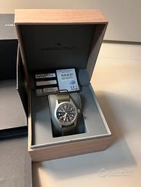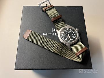 Come da titolo vendo per inutilizzo questo orologio Hamilton Khaki Field Mechanical con cassa da 38mm, versione con cinturino nato verde, quadrante nero.