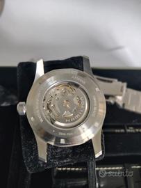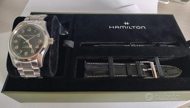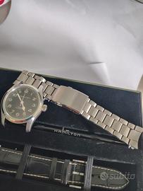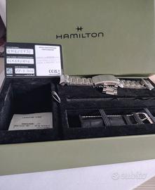 vendo bellissimo Hamilton Murph modello 42mm l' orologio è equipaggiato col famoso calibro H 10 con 80 ore di riserva di carica! naturalmente è un modello iconico usato nel film Interstellar di Christopher Nolan,sulla sfera dei secondi ha stampato in codice morse la parola Eureka, visibile al buio. vendo l edizione in cofanetto veramente stupenda! nella scatola originale in edizione speciale sono presenti anche il bracciale in acciaio con finali pieni marchiato Hamilton con aggancio rapido,uno strumento per rimuovere le molle dalle anse e naturalmente il cinturino nero stampa coccodrillo inconfondibile. acquistato marzo 2026, garanzia Hamilton per quasi 2 anni!!! specifico che come si vede dalle foto il cinturino non è mai stato indossato,ed il bracciale non presenta segni di usura. dal sito ed in gioielleria il costo è di 1195 Euro!