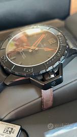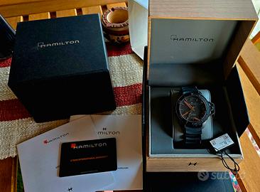 Questo Hamilton Frogman si distingue per la sua robusta cassa con finitura PVD nera e i vivaci accenti arancioni sulle sfere, che garantiscono una leggibilità eccezionale anche in condizioni di scarsa luce. Un orologio tecnico, nato originariamente per i sommozzatori della Marina Militare Americana, perfetto per chi cerca un segnatempo sportivo che non passa inosservato. Caratteristiche Principali: Referenza: Collezione Khaki Navy Frogman. Movimento: Automatico Svizzero (Calibro H-10) con 80 ore di riserva di carica. Cassa: Acciaio inossidabile con rivestimento PVD nero, diametro 46mm circa. Quadrante: Nero con indici applicati e lancette con profilo arancione. Vetro: Zaffiro inscalfibile. Resistenza all'acqua: 30 bar (300 metri / 1000 ft). Cinturino: Originale in gomma nera "wave" (stile a fisarmonica), ultra resistente e confortevole per l'uso sportivo. Dettagli iconici: Proteggi-corona a leva brevettato, distintivo della linea Frogman. Condizioni dell'oggetto: Stato: L'orologio è usato ma in ottime condizioni estetiche e meccaniche. Vetro pulito, corona e ghiera perfettamente funzionanti. Corredo: completo di scatola, contro scatola, manuali garanzia e card datata 2023. Valuto eventuali permute con orologi diver come Hamilton, Longines, Seiko, no vintage, solo scambio a mano a Torino. Molto gradito lo scambio a mano, in caso di spedizione accetto unicamente pagamento tramite bonifico bancario, quando visualizzo l'accredito spedisco e comunico il tracking del pacco. Non uso il sistema di tutto subito pertanto non accetto proposte di acquisto. Orologio originale al 100% e di mia esclusiva proprietà. Foto reali.