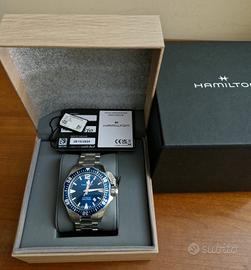 Splendido Hamilton Khaki Navy Frogman Automatico 300m condizioni eccellenti. Garanzia Internazionale ancora Attiva acquistato 1 anno e mezzo fà (28 Ottobre 2024). Creato per i sommozzatori della Marima Americana ed apparso nel celebre film "Le rane del mare" del 1951. Referenza: H32616133 Calibro: H10 Movimento: Carica automatica Cassa: 42 mm Vetro: zaffiro Bracciale: Acciaio con estensione per muta