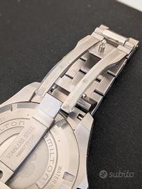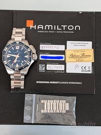 Vendo Hamilton Khaki Navy Frogman full set. L'orologio è pari al nuovo, solo messo a misura e provato saltuariamente al polso. Parzialmente pellicolato (si vedano le foto dell'annuncio), con card, documenti, scatola, controscatola. No scambi.