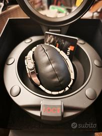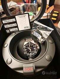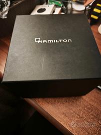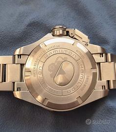 Caratteristiche •ReferenzaH77605135 •CalibroH-10 •CollezioneKhaki Navy •MovimentoCarica automatica •Dimensioni della cassa42mm •Spessore (mm)12.5 •Colore quadranteNero •Materiale della cassaAcciaio •VetroZaffiro •Larghezza ansa20 mm •Riserva di carica80 ore •StatoCollezione attuale •Impermeabilità30 bar (300m) •Anti ReflectionSì •Corona a viteSì •Super LuminovaSì Cinturino •Accessorio REFH6057761051 •Tipo cinturinoAcciaio •Tipo di fibbiaFibbia pieghevole •Movimento •H-10 •Movimento a tre sfere con data e riserva di carica superiore di 80 ore, l'H-10 presenta elaborati motivi colimaçon e perlati a contrasto per i modelli American Classic e superfici pulite per gli orologi da pilot L'Hamilton Frogman originale era stato creato per i sommozzatori della Marina americana ed è apparso nel celebre film del 1951 "Le rane del mare". Da allora sono passati quasi 70 anni e la tecnologia ha fatto passi da gigante nell'orologeria. Le caratteristiche essenziali che hanno decretato il successo dell'orologio, non inferiore a quello del film, sono però le stesse: lunetta girevole unidirezionale, elevata impermeabilità e luminescenza subacquea.