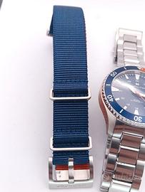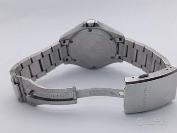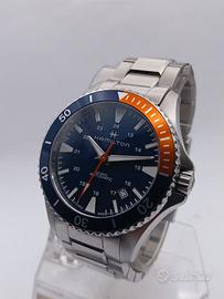 HAMILTON KHAKI NAVY SCUBA AUTO – L'Icona Diver in Condizioni Eccellenti Se cerchi un orologio che unisca l'affidabilità svizzera a un design dinamico e sportivo, questo Hamilton Khaki Navy Scuba (Ref. H82365141) è la scelta definitiva. Caratterizzato dalla splendida lunetta blu con inserto arancio "Pepsi-style", è un segnatempo pronto a passare dalla spiaggia all'ufficio senza mai sfigurare. DETTAGLI TECNICI e PRESTAZIONI: Movimento: Calibro automatico H-10 Swiss Made con un'incredibile riserva di carica di 80 ore (lo posi il venerdì, lo riprendi il lunedì ed è ancora perfettamente in marcia). Cassa: Acciaio inossidabile da 40 mm, misura perfetta per ogni polso, bilanciata e confortevole. Quadrante: Blu profondo con indici e lancette trattati in Super-LumiNova per una visibilità perfetta al buio. Vetro: Zaffiro inscalfibile con trattamento antiriflesso. Impermeabilità: Fino a 10 bar (100 metri). DOTAZIONE E CONDIZIONI: L'orologio si presenta in CONDIZIONI ECCELLENTI, trattato con la massima cura da collezionista. FULL SET: Completo di scatola originale, controscatola, manuali e garanzia. ️ BRACCIALE: In acciaio massiccio originale, regolato per polsi fino a 18,5 cm. BONUS NATO: Incluso nella vendita cinturino NATO originali Hamilton (perfetti per un look estivo e leggero). DISPONIBILE SUBITO PRESSO: Viola Orologi – Poggiomarino (NA)