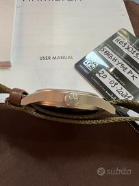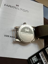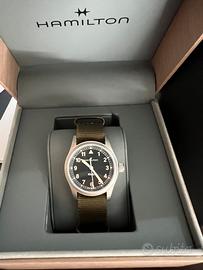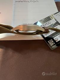 Nuova linea khaki quartz, misura cassa 33 mm ispirata al militare assegnato. Quadrante con disegno a binario come i vecchi Hamilton militari. Cinturino nato di pregio in dotazione. Ansa 18 mm, spessore 7,5 mm, vetro zaffiro. Calibro ETA quartz F05.105.
