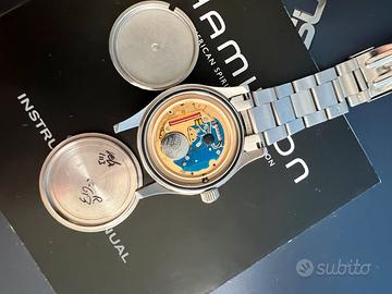 Referenza H684 110, interessante per gli amanti degli Hamilton militari. L’orologio ha pila e guarnizione nuova; perfettamente funzionante. Non ho scatola, né corredo; l’orologio viene venduto nelle condizioni attestate dalle foto.