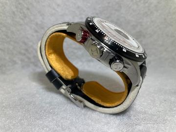 Buone condizioni generali,vetro zaffiro perfetto ma cassa con qualche segno da usura,fornito con cinturino originale.Non dispongo di scatola e garanzia perché perse durante il trasloco,non ricordo la data dell’ultima revisione ma tiene perfettamente il tempo,cronografo spettacolare.