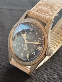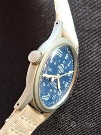 Propongo un classico Hamilton Khaki con la caratteristica e ricercata ancora nel logo, che indicava l'assegnazione alla marina militare. Quadrante blu, fibbia originale e scatola le caratteristiche più significative.