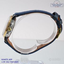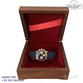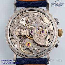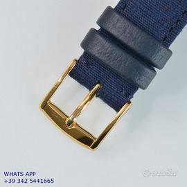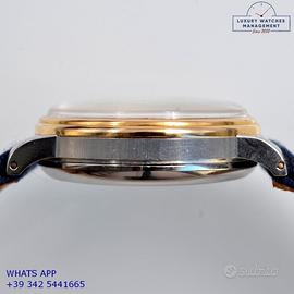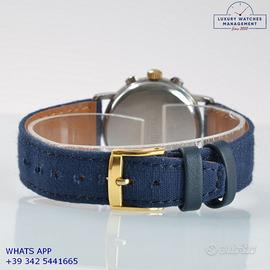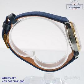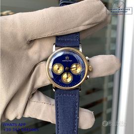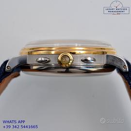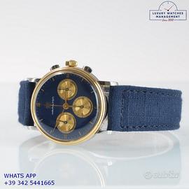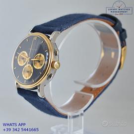 Hamilton Lancaster cronografo 33MM acciaio e oro giallo 18KT, anno di produzione 1970 circa, ghiera oro giallo 18KT a gradino, vetro plastica bombato, quadrante colore blu a tre contatori orizzontali colore champagne, movimento meccanico a carica manuale, cinturino in tessuto colore blu con fibbia dorata originale americana.