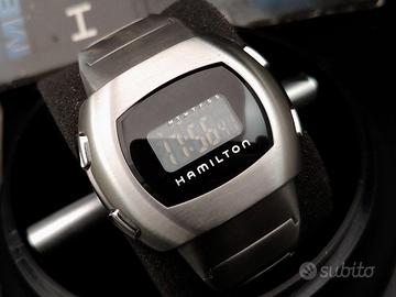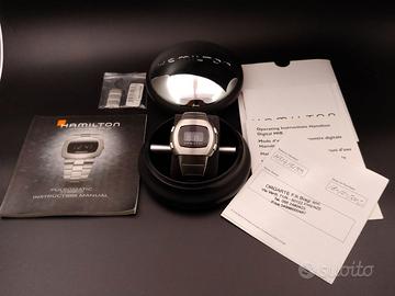 Raro Hamilton “Men in Black II” digitale, edizione speciale dei primi anni 2000 ispirata al famoso film, con cassa in acciaio satinato dalla linea futuristica e display LCD ibrido incorniciato da vetro nero, che richiama l’estetica del celebre Pulsar degli anni ’70.