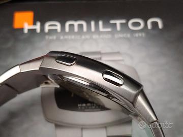 Bracciale originale Hamilton in acciaio satinato, con chiusura deployante firmata, lunghezza massima sul polso di circa 200mm (con maglie di riserva incluse in dotazione).