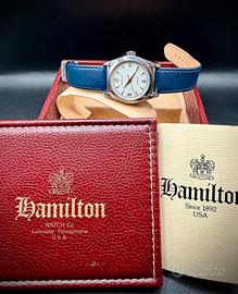 Hamilton Ovettone referenza 7040A Orologio raro da collezione in serie numerata 1000 pezzi al mondo cassa numero 548 Movimento automatico Eta 2824-2 swiss made, revisionato e perfettamente funzionante Diametro cassa 35mm esclusa corona di carica Vetro plexi - datario ore 3 Fondello a vite con guarnizione nuova Cinturino in pelle nuovo con fibbia originale logata Orologio completo di scatola e documenti full set