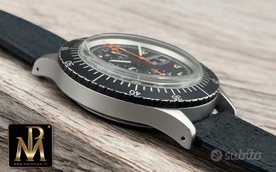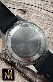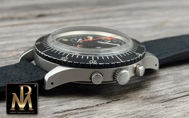 La cassa da 43 mm conserva la sua presenza importante al polso, con linee nette e proporzioni piene, tipiche dei cronografi professionali dell’epoca. Il quadrante, è molto ben conservato, con indici e lancette trizio in condizioni eccellenti e una leggibilità immediata che richiama la sua destinazione d’uso originaria anche se poi non venne mai assegnato.
