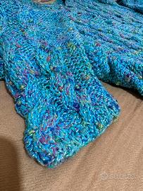 Cardigan artigianale in filato mouliné turchese e viola con riflessi cangianti. Lavorazione a mano con motivo a trecce, maniche corte, bottoni coordinati. Un capo estivo sofisticato e dal colore vibrante. Pezzo unico.