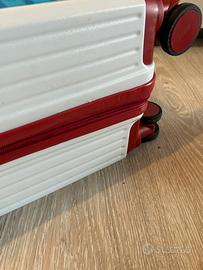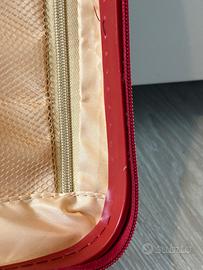 Hello Kitty Valigia Trolley Borsa Viaggio Ragazza. Bellissima valigetta. In plastica con chiusura di sicurezza con codice (mai provato) e sul frontale immagine lenticolare 3D che cambia figura . Si trova in buono stato solo in una parte e' saltata la cucitura (evidenziato in foto )ma è stata riparata con colla idonea quindi non ne inficia l'uso né tanto meno l'estetica. Difficile da trovare . Molto molto carina ☺️