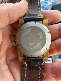 Set completo, orologio indossato 2/3 volte Cassa in ottone 45 mm Vetro zaffiro antiriflesso Fondello in titanio Movimento automatico Seiko Cinturino originale in gomma Cinturino in cuoio invecchiato con fibbia originale in ottone Splendido modello sold our Solo vendita, no scambi, no proposte assurde