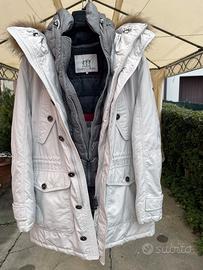 Giaccone parka Henry Cotton's colore bianco ghiaccio, interno grigio, idrorepellente, imbottito e foderato, chiusura doppia con zip e bottoni, colletto in pelliccia rimuovibile.