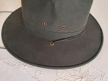 Semirigido, colore verde scuro. Taglia L circonferenza 56, tesa 8 cm, altezza 12 cm, larghezza inclusa tesa 34 cm.