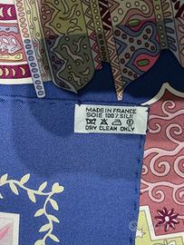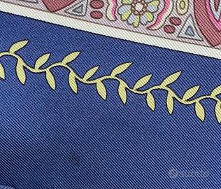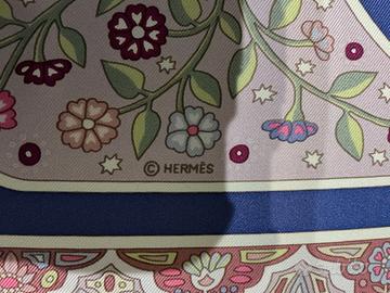 Bellissimo foulard di Hermès. Perfetto per la primavera, color lavanda. Tema: “Aux Portes du Palais” Usato poche volte. Impeccabile tranne una minuscola macchiolina sul bordo (vedi ultima foto). Privo di profumo o fili tirati. Si abbina perfettamente al blu, jeans, nero, marrone, beige… a te la scelta! Ovviamente con la sua scatola originale Hermès