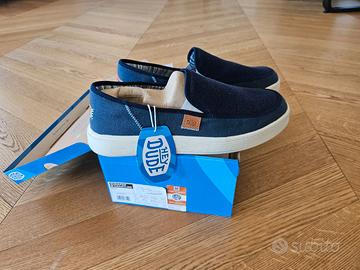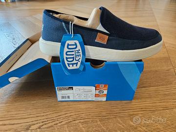 Scarpe Hey Dude nuove, mai indossate, in confezione originale, corredate di etichetta ed ancora con calzare protettivo di cartone all'interno. Vendo per errato acquisto a metà del prezzo (prezzo d'acquisto originale 69,99€). La misura è la 46. Il nome del modello è Sunapee M Coastline, in colore blu. Molto belle e comode.