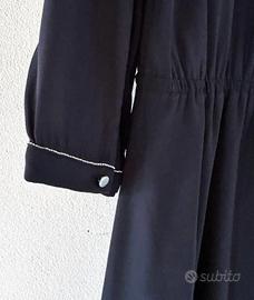 Raffinato abito corto ideale per cerimonie o occasioni formali. Caratterizzato da uno scollo a V con bottoni a scomparsa fino alla vita e maniche leggermente a sbuffo. Il design è impreziosito da un’elegante catenella argentata lungo la scollatura e sui polsi, che dona un punto luce sofisticato.