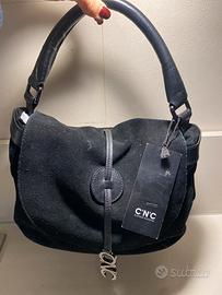 Autentica borsa camoscio nera con manico e alcuni inserti in pelle nera. Zip e 2 tasche interne il tutto logato CoSTUME NATIONAL