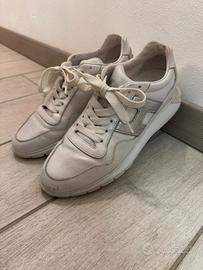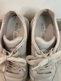 Hogan bianche da donna, numero 38 e mezzo, usate con alcuni segni di usura normali. Il modello è interactive. Le scarpe sono in buone condizioni generali, mantenendo la loro eleganza e comfort.