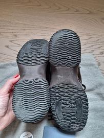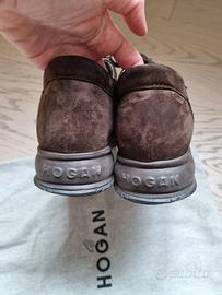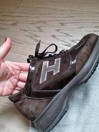 Scarpe originali da donna HOGAN mod. Interactive, tg 36,5 (calzata abbondante), col marrone scuro, tomaia in camoscio, inserti in vernice e logo in raso e in rilievo, indossate con cura, dotate di dustbag.