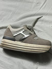 Vendo paio di scarpe hogan originali modello maxi platform con alta suola 4,5 cm, senza scatola, in camoscio grigio e tela bianca, numero 37.