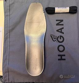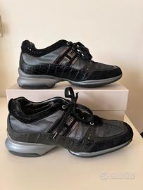 Hogan nere active allacciate molto stilose, in pelle e tessuto tecnico con inserti in cocco e camoscio, con linguetta, retro e ricamo esterno del logo in bronzo metallico-Piccoli punti luce bronzati che illuminano la scarpa - Indossate 3 volte, praticamente nuove e tenute benissimo, complete di scatola originale, dustbag logata e stringhe di ricambio
